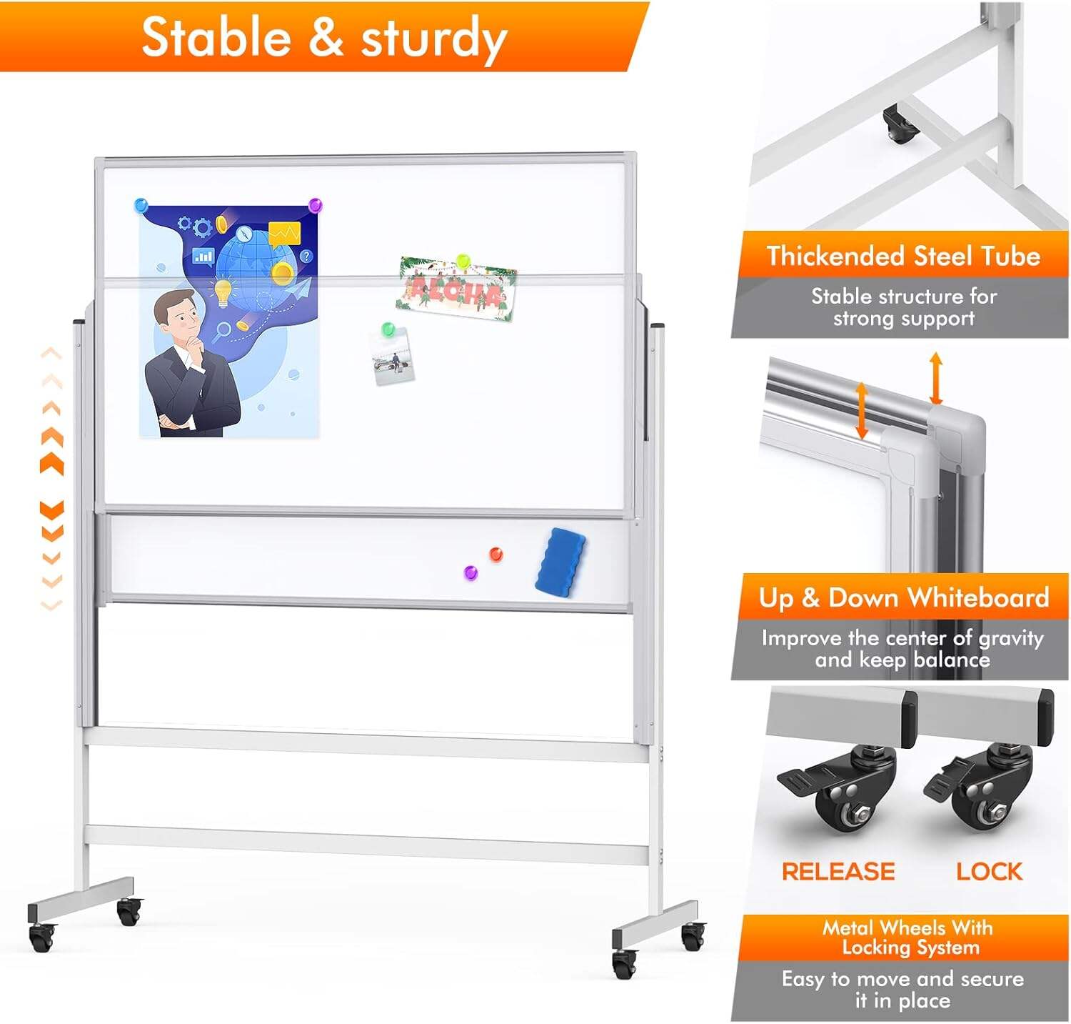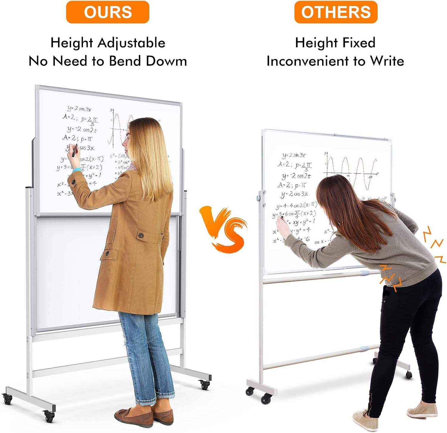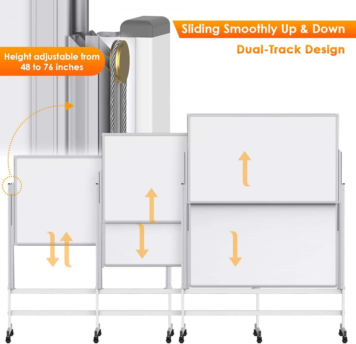 - Adjustable & Switchable Height: The dual-track design is introduced into the construction of large mobile dry-erase board. This allows for easy maneuvering between boards and keep important notes at eye level. The adjustable height, which can be extended from 48 inches to 76 inches, can meet the needs of both adults and kids while sitting or standing. Moreover, interactive teaching or parent-child activities will be more diverse and interesting with this mobile standing whiteboard.