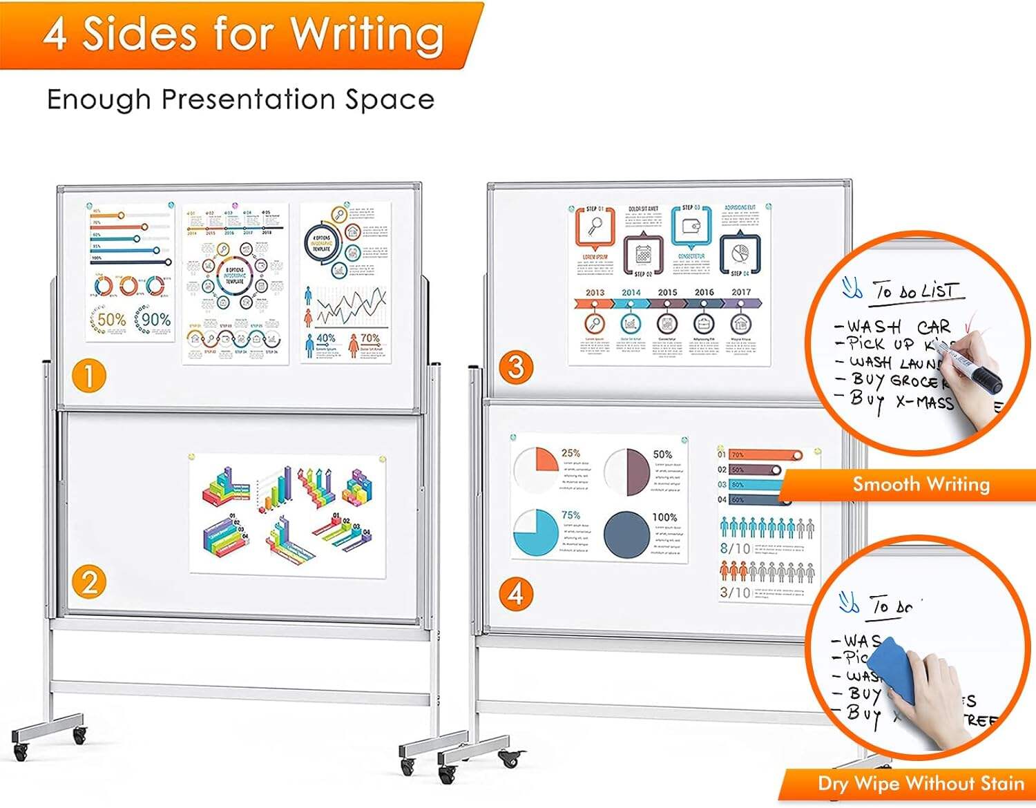 - Get 4 Writing Surfaces on Just 2 Panels: 48 x 60 inches Mobile Whiteboard is finished with two (48 x 30 inch) double-sided magnetic whiteboard. This gives you enough space to write, record, and present your ideas, making your communication or teamwork more effective and saving valuable floor space in compact areas. All 4 writing surfaces are magnetic, making them suitable for writing and discussions or meetings where multiple reports or pictures need to be displayed at the same time.